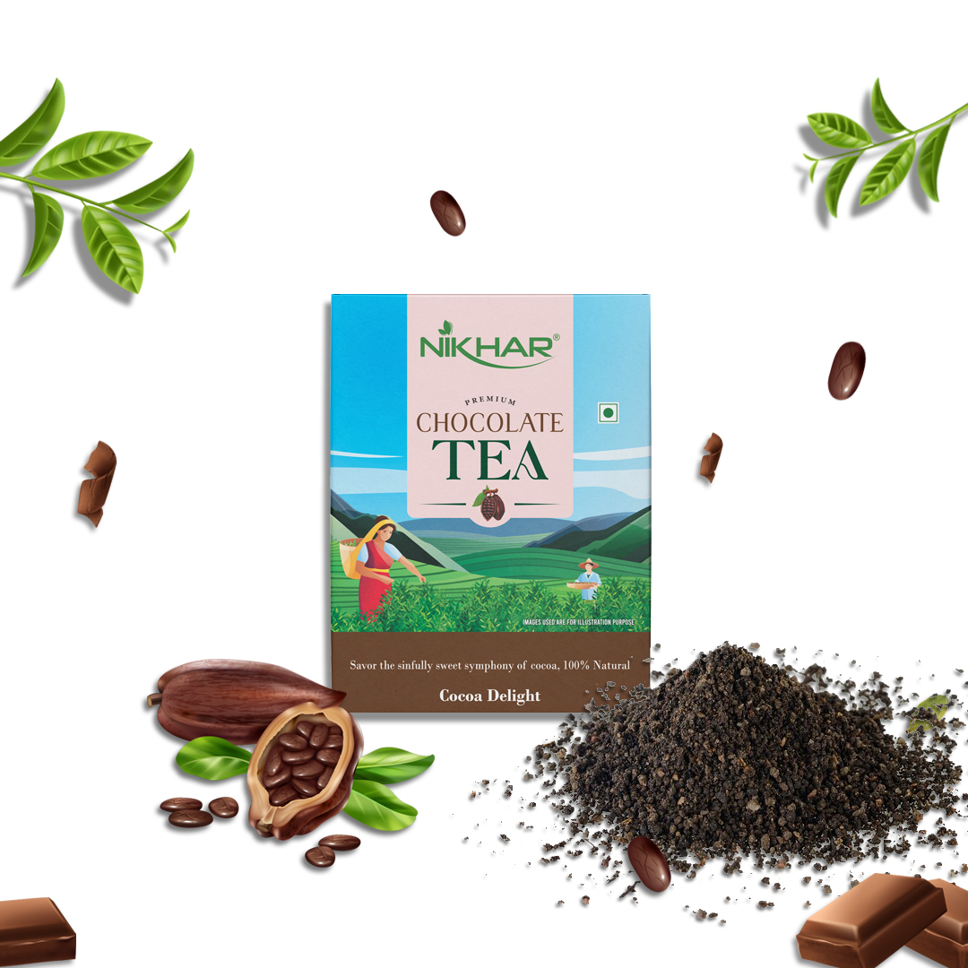 Nikhar Chocolate Tea is a luxury tea blend crafted by Nikhar Tea. It combines the bold taste of Assam tea leaves with the richness of 100% natural cocoa extract and cocoa powder, creating a delightful chocolate-flavored chai experience